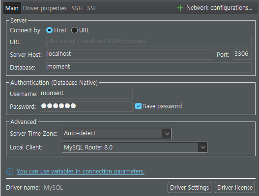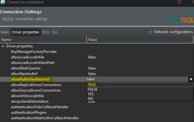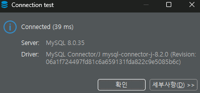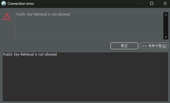 에러가 발생하는 원인은 useSSL=false로 설정하고 allowPublicKeyRetrieval 설정을 하지 않은 경우라고 한다. 이 부분은 드라이버에서 설정해주면 된다.