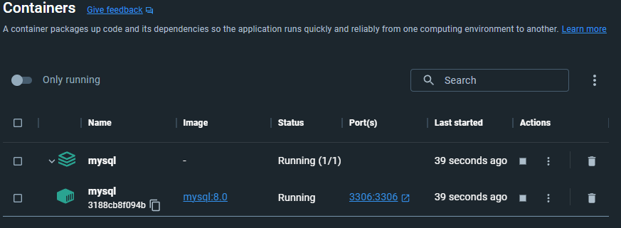 파일이 있는 경로로 가서 해당 명령어를 실행하면 설정한 환경으로 MySQL 컨테이너가 생성 및 실행된다.