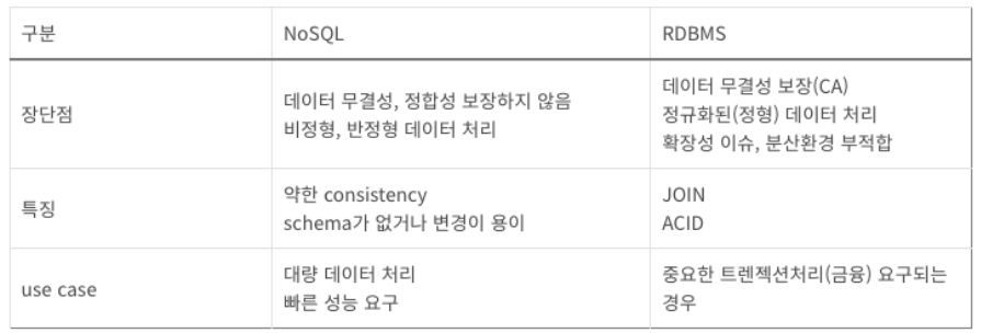 - NoSQL에서는 RDBMS와는 달리 테이블 간 관계를 정의하지 않는다.