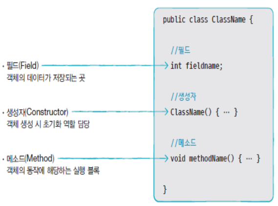 - 자바에서 클래스는 객체의 데이터가 저장되는 필드(Field)와 객체 생성 시 초기화 역할을 담당하는 생성자(Constructor), 객체의 동작에 해당하는 실행 블럭인 메소드(Method)를 가진다.