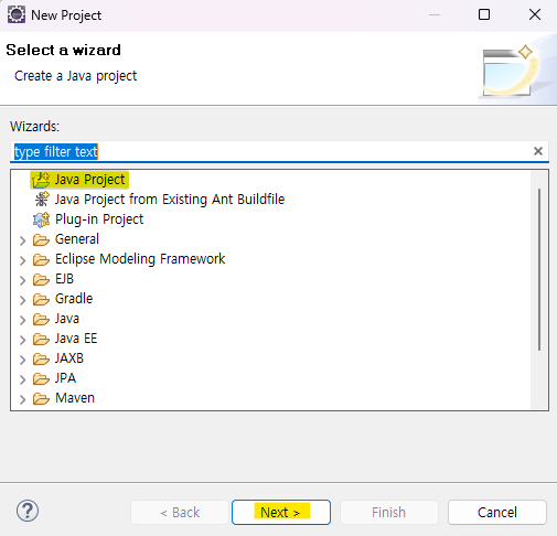 ※ 만약 New 다음에 Java Proejct가 있는 경우 그것을 바로 클릭해주면 됩니다 ※