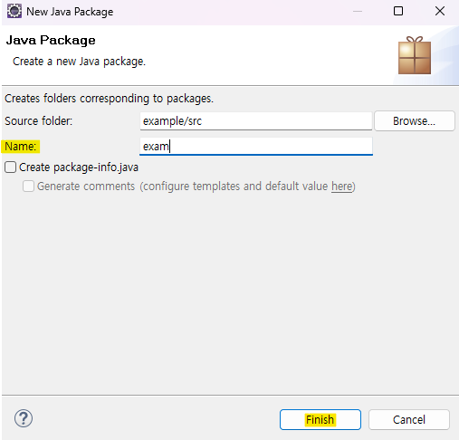 - src 파일 밑에 있는 exam 패키지 내에 Class 파일을 생성하는 작업