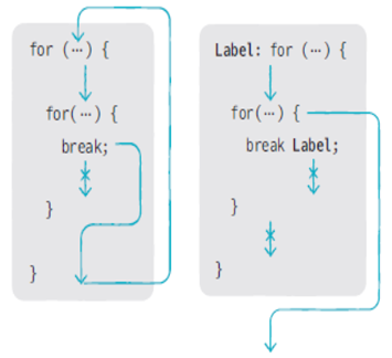 반복문이 중첩되어있을 경우 break문은 가장 가까운 반복문만 종료한다. 만약 중첩된 반복문에서 바깥쪽 반복문까지 종료시키려면 바깥쪽 반복문에 이름(라벨)을 붙인다.