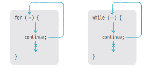 break문은 반복문을 아예 종료하지만, continue문은 종료하지 않고 다시 조건식으로 이동한다(반복문은 계속 수행된다). 특정 조건을 만족하는 경우, continue문을 사용해서 이후 문장을 실행하지 않고 다음 반복으로 넘어간다.