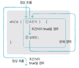 조건식 true일 경우에 계속 반복한다. 조건식에는 주로 논리 연산식이 온다. false일 경우 반복을 멈추고 while 블록을 종료한다.