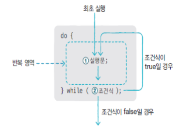 실행문이 우선 실행된 후 조건식을 검사한다. 조건식이 true이면 실행문을 반복 수행하고, false면 do-while문을 종료한다.