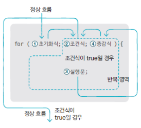 조건식의 값이 참일동안 반복을 계속하고, 거짓이면 반복을 중단해 for문을 벗어난다.